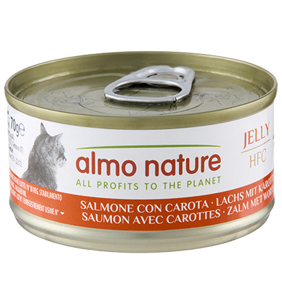 Almo Nature HFC Jelly Salmon with Carrot – hrană complementară Human Grade pentru pisici, monoproteică și fără gluten, cu somon 55% și morcov 5% în bulion de pește;