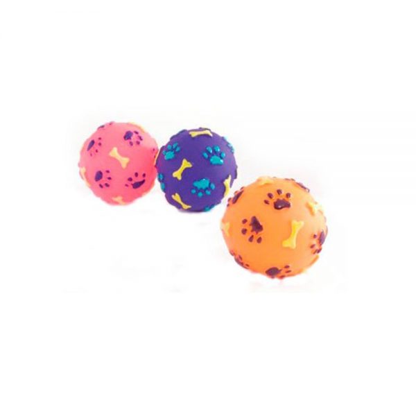Jucărie din vinil sub formă de minge de diverse culori cu print de lăbuțe și os. Jucăria este perfect potrivită pentru câini de toate vârstele.