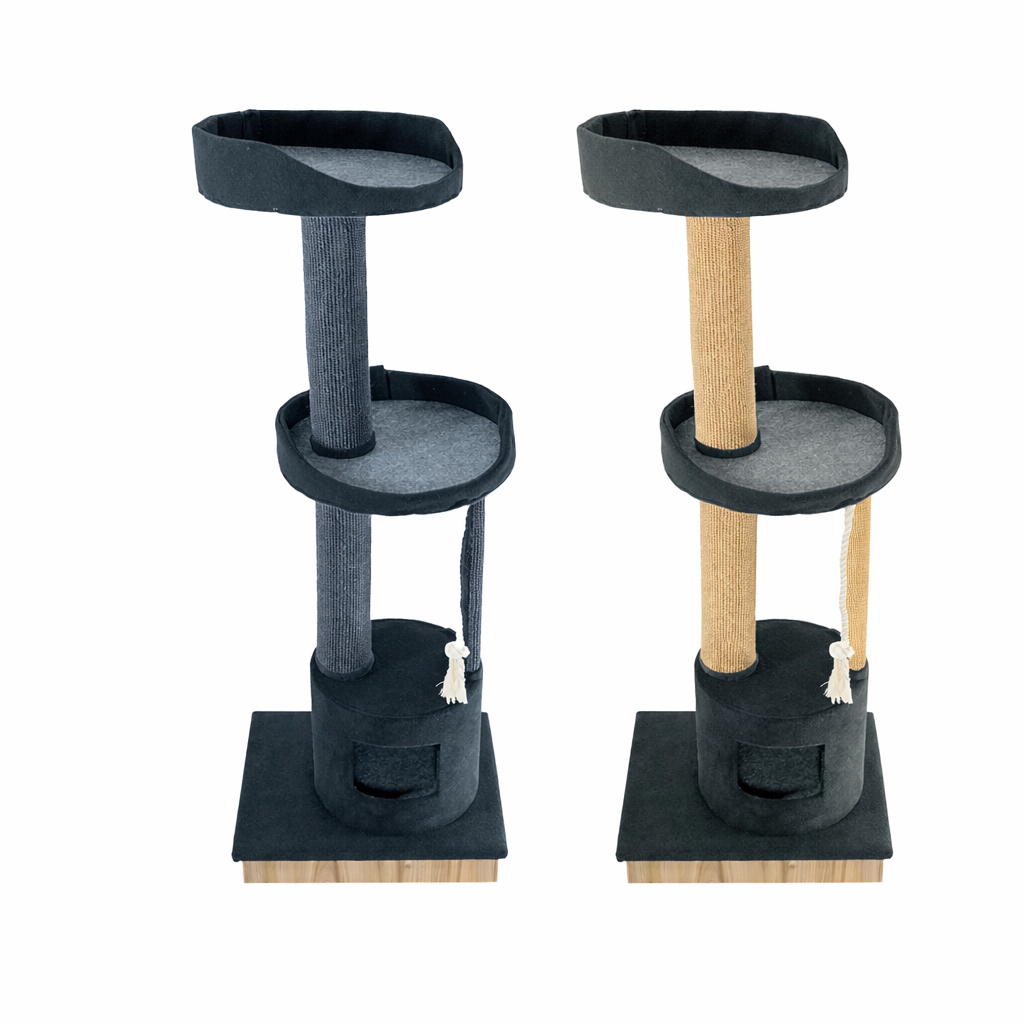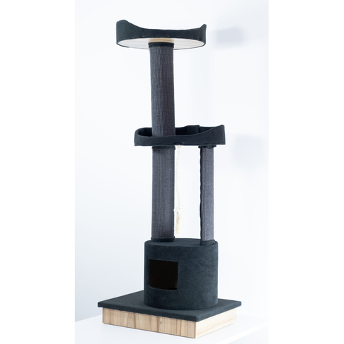 Scratchers Family Eco Mega Jack este un ansamblu modern și ecologic pentru pisici, creat din pasiune pentru animale și pentru protecția mediului. Produsul este realizat din placă de mobilier, sisal și material textil provenite din materiale 100% reciclate, oferind o soluție sustenabilă și durabilă pentru joaca și odihna pisicii. Modelul Mega Jack dispune de o suprafață generoasă pentru zgâriere, două rafturi confortabile pentru relaxare și observare, o căsuță pentru odihnă și o sfoară pentru joacă interactivă. Stâlpii cu diametrul de 12 cm asigură stabilitate și rezistență, iar baza solidă permite integrarea ușoară în designul interior. Ansamblul este disponibil în diferite nuanțe de negru, bej și gri, culorile putând varia în funcție de materialele reciclate utilizate.