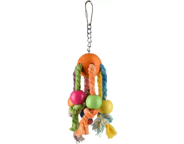 RAINBOW SPY MULTI – забавная деревянная игрушка для птиц, сделанная из прочной веревки и разноцветных бусин со звонким колокольчиком для дополнительного удовольствия.