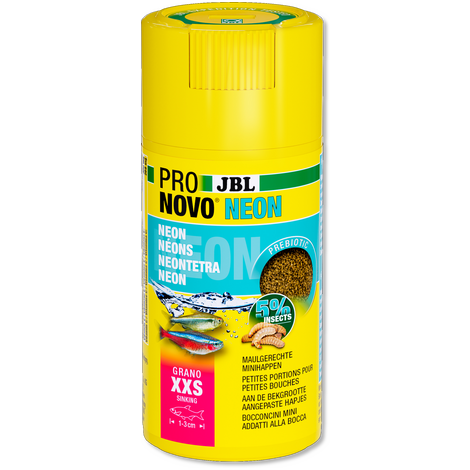 JBL PRONOVO NEON GRANO – hrană granule de bază pentru neon și alți pești characide Granule scufundătoare dedicate neonilor și altor characide mici, formulate conform dietei lor naturale. Îmbogățite cu prebiotice care sprijină flora intestinală și digestia sănătoasă. Beneficii: Formulă prebiotică pentru o digestie sănătoasă și reducerea poluării apei. Ingrediente naturale, fără coloranți sau conservanți artificiali. Acceptare excelentă chiar și la speciile de characide mai sensibile. Conține somon, creveți, spirulină și insecte – similar cu dieta naturală. Astaxantina naturală din krill și spirulină intensifică culorile neonilor și ale altor characide. Ambalaj practic: cutie etanșă reciclabilă cu click dozator