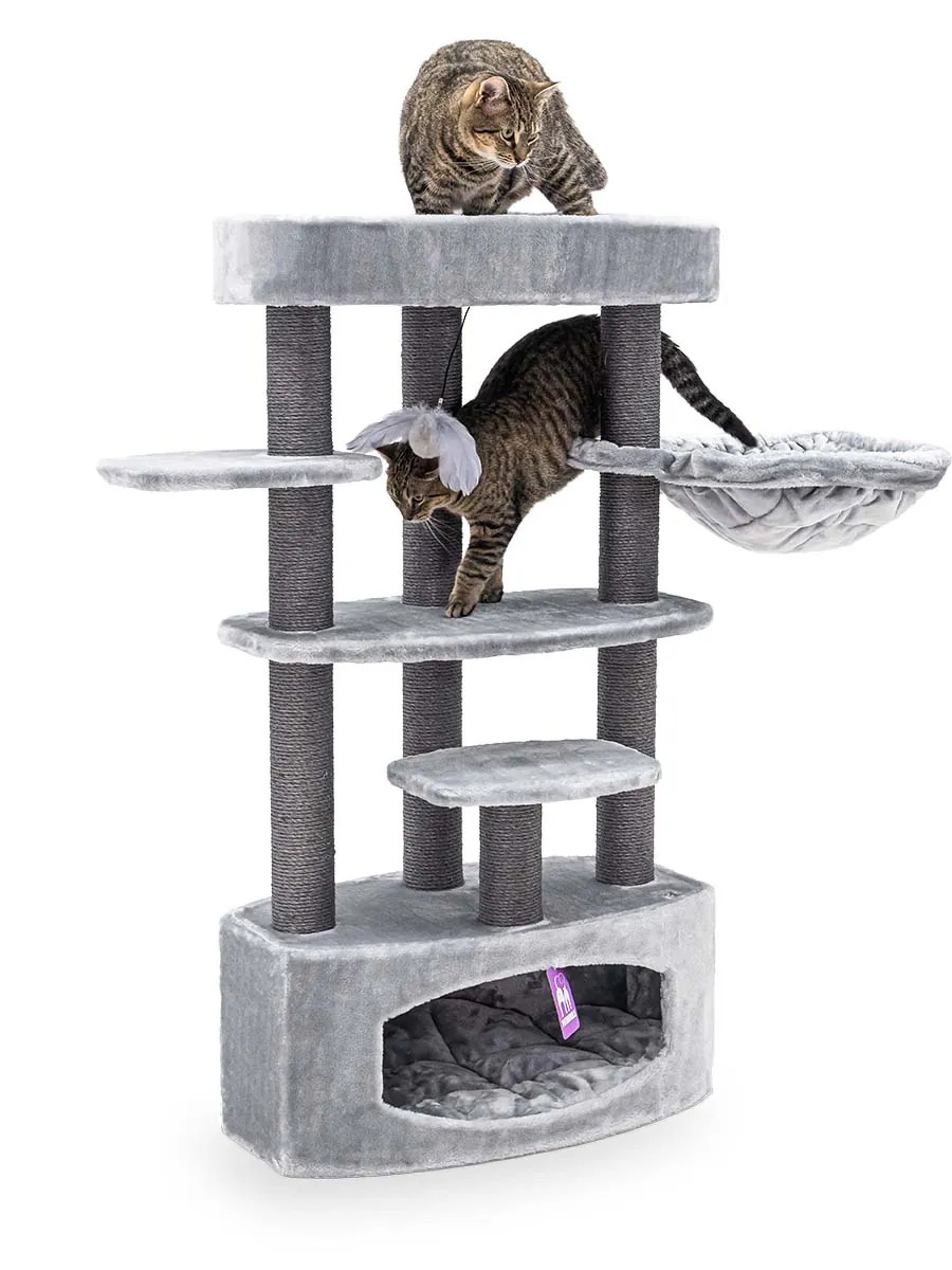 Cat Tree Alexandra 127 este un ansamblu de zgâriere confortabil și elegant, creat pentru a oferi pisicii tale un spațiu sigur de odihnă, joacă și cățărare. Construcția compactă, acoperită cu pluș moale de înaltă calitate, include trei zone de dormit: un hamac relaxant, un coș lounge spațios și o căsuță confortabilă cu pernă moale în interior. Stâlpii de zgâriere înalți, acoperiți cu sisal natural rezistent, permit întreținerea ghearelor și încurajează activitatea zilnică. Platformele largi facilitează urcarea și oferă puncte de observație ideale. Modelul este potrivit în special pentru pisici mici, tinere sau de talie medie, oferind combinația perfectă între confort și funcționalitate. Caracteristici 3 spații confortabile de odihnă: hamac, coș lounge și căsuță Stâlpi de zgâriere din sisal natural durabil Pluș premium moale pentru confort maxim Platforme stabile pentru cățărare și joacă Hamac detașabil Pernă lavabilă pentru igienă ușoară Include jucăria Funky Rebel pentru divertisment suplimentar Dimensiuni 70 × 40 × 127 cm Greutate: aprox. 21,7 kg Culori disponibile Cream cu sisal natural Grey Pepper