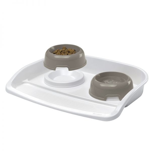 Большой поднос LINDO с пласт. мисками, Lindo – пластиковый поднос с мисками для кошек и собак, который поможет вам сохранить место для кормления в чистоте. На подносе спереди имеется место для лап животного, по бокам и сзади расположены бортики для защиты от просыпания корма и проливания воды. Поднос идет в комплекте с двумя пластиковыми мисками (Party 4, с объемом 0.3 л). Они очень практичные, позволят вам разместить сухой или сырой корм и воду одновременно. Благодаря антискользящим ножкам вы сможете надежно разместить Lindo в любом месте вашего дома, а уход не займет у вас много времени – миски легко снимаются с подноса.