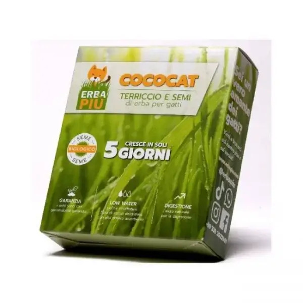 COCOCAT ERBA PIU – SOIL and SEEDS — это комплект для выращивания травы, предназначенной специально для кошек. Трава помогает кошкам очищать желудок и улучшает пищеварение. В комплект входят натуральный кокосовый субстрат (soil) и семена (seeds) для лёгкого выращивания дома.