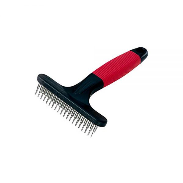 Cпециальная расческа-грабли для удаления колтунов с шерсти собаки. Теперь спутанная шерсть не будет больше проблемой благодаря этой расческе, которая отлично справится с поставленной задачей. Изделие имеет округленные зубцы, которые не будут раздражать кожу вашего четырехногого друга. Два ряда зубцов вдвойне надёжно расчешут шёрстку питомца. Это – прекрасный продукт для собак со средней и длинной шерстью.