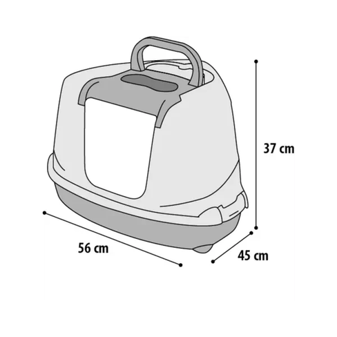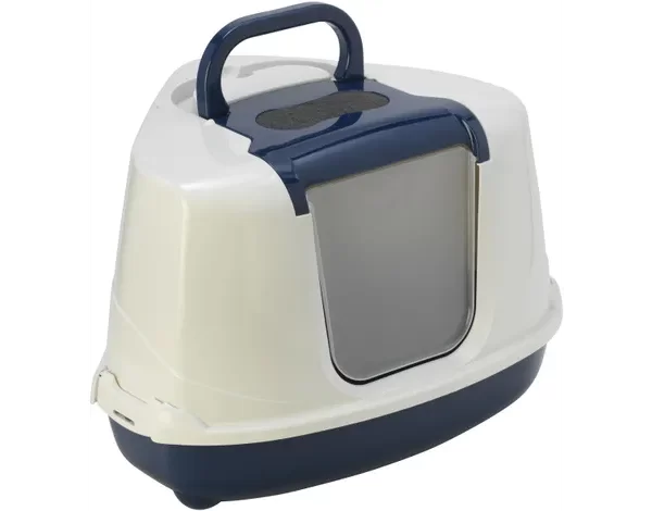 Закрытый угловой туалет для кошек, имеющий треугольную форму, не занимает много места и легко убирается благодаря дополнительной откидной крышке. В комплекте также имеется лопатка.
