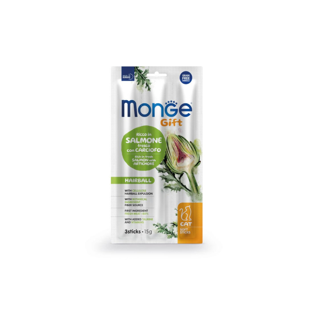 MONGE GIFT HAIRBALL CAT RICH IN FRESH SALMON WITH ARTICHOKE — мягкие палочки с лососем и артишоком — является дополнительным кормом для взрослых кошек. Специально разработан для хорошего самочувствия вашей кошки благодаря содержанию целлюлозы, способствующей физиологическому выталкиванию комков шерсти, и благодаря низкому содержанию жира для поддержания идеальной массы тела. Продукт, приготовленный без злаков и со свежим мясом, ценным источником легкоусвояемых белков с биологической ценностью. Формула обогащена таурином для поддержания остроты зрения и нормальной работы сердца, а также витаминами для ежедневного бодрствования. Включение растительных ингредиентов, таких как листья артишока, источник нерастворимой клетчатки для регулярного кишечника, является результатом исследований «Сделано в Италии», направленных на улучшение качества жизни наших кошек. Без добавления искусственных красителей и сахара.