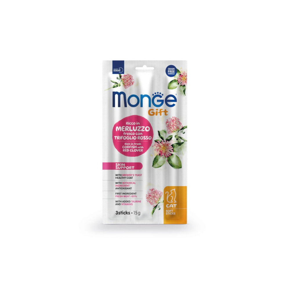 MONGE GIFT SKIN SUPPORT CAT RICH IN FRESH CODFISH WITH RED CLOVER — мягкие палочки с треской и красным клевером — является дополнительным кормом для взрослых кошек. Специально разработан для хорошего самочувствия вашей кошки благодаря пивным дрожжам для блестящей шерсти и благодаря низкому содержанию жира для поддержания идеальной массы тела. Продукт, приготовленный без злаков и со свежим мясом, ценным источником легкоусвояемых белков с биологической ценностью. Формула обогащена таурином для поддержания остроты зрения и нормальной работы сердца, а также витаминами для ежедневного бодрствования. Включение растительных ингредиентов, таких как красный клевер, антиоксидант для поддержания целостности кожи, является результатом исследований «Сделано в Италии», направленных на улучшение качества жизни наших кошек. Без добавления искусственных красителей и сахара.