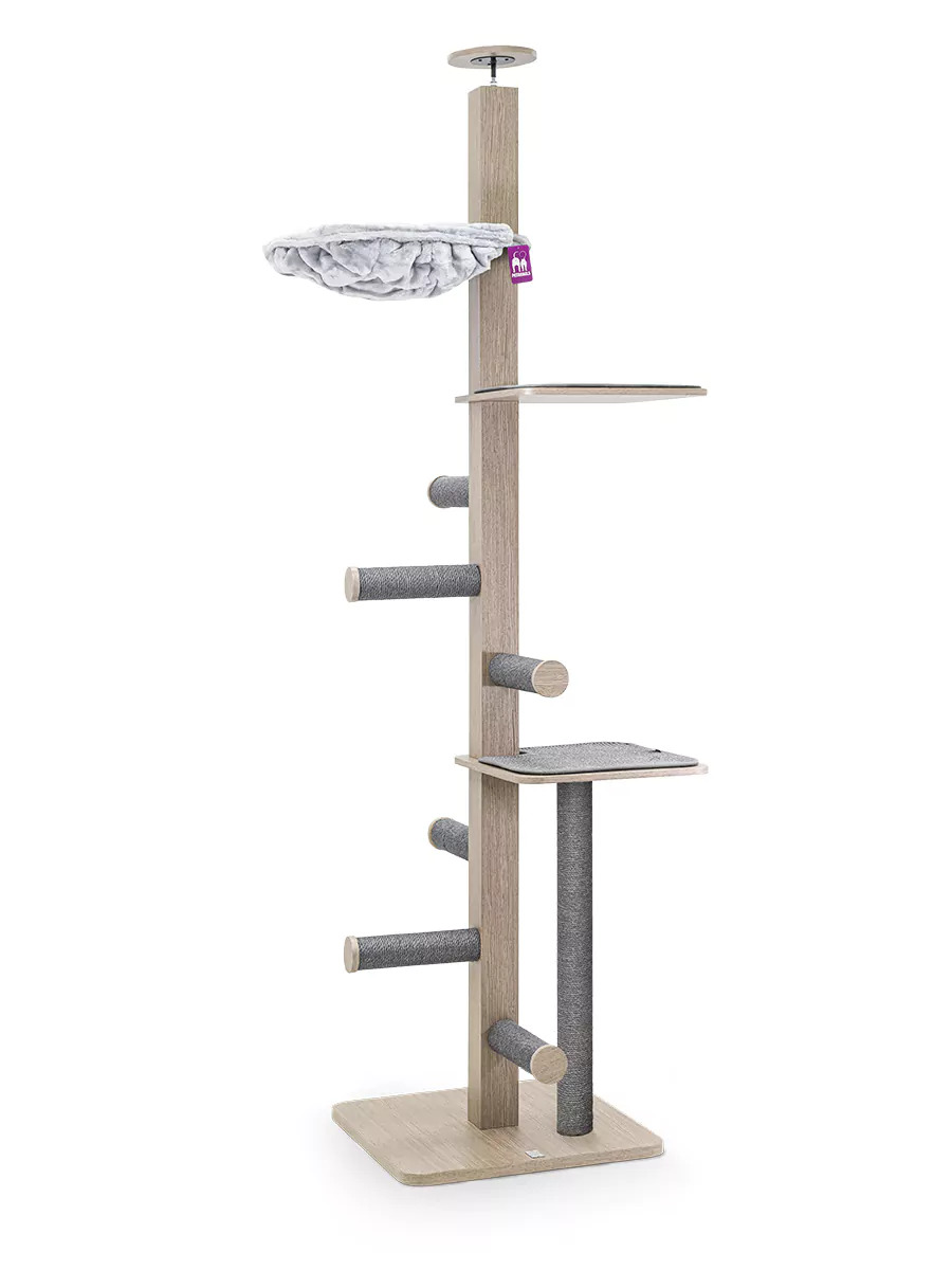Когтеточка-комплекс Aquarius 265 — это стильная вертикальная конструкция с телескопической системой крепления к потолку, которая обеспечивает устойчивость и экономит пространство в помещении. Изготовленный вручную из натурального эвкалиптового дерева, комплекс отличается современным минималистичным дизайном. Прочные сизалевые коврики позволяют кошке безопасно точить когти и поддерживать активность. На верхнем уровне расположен просторный мягкий гамак, где питомец может комфортно отдыхать и наблюдать за окружающим пространством. Высота регулируется, что позволяет устанавливать модель в помещениях с потолками от 243 до 265 см.