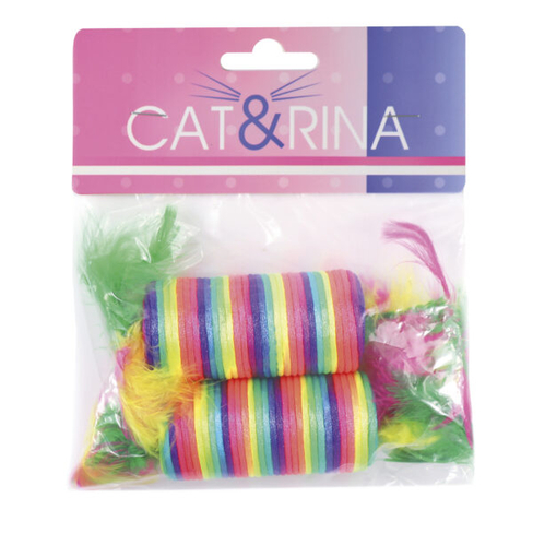 Игрушка для кошек: пара матерчатых разноцветных цилиндров с перьями.